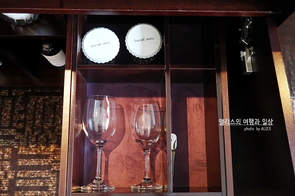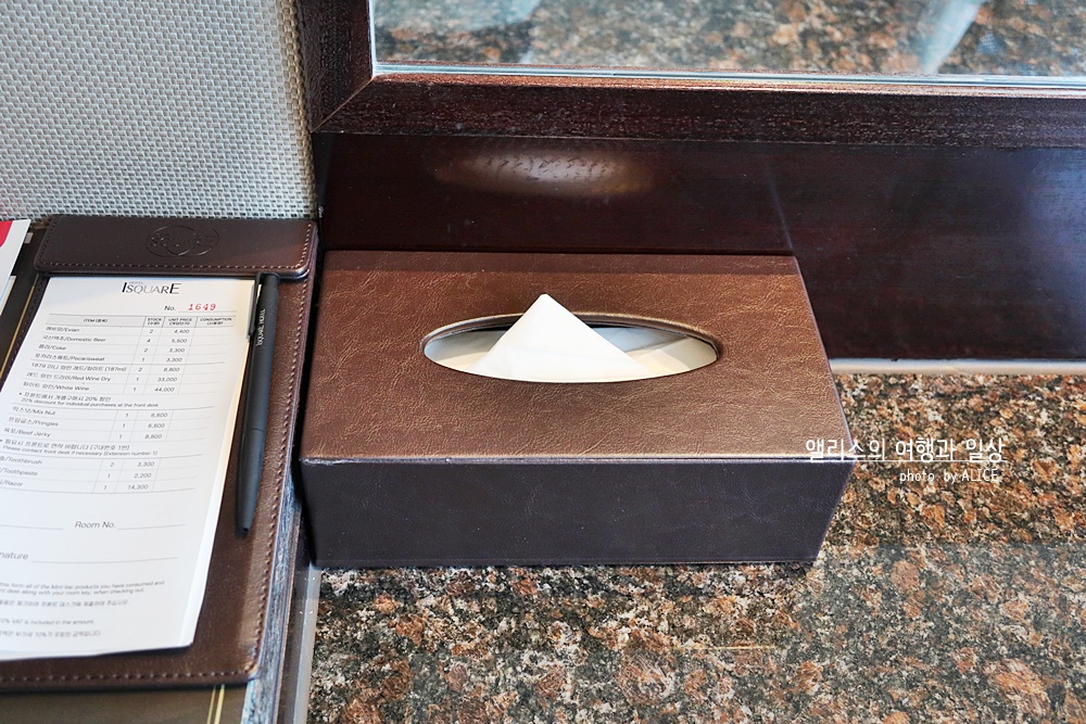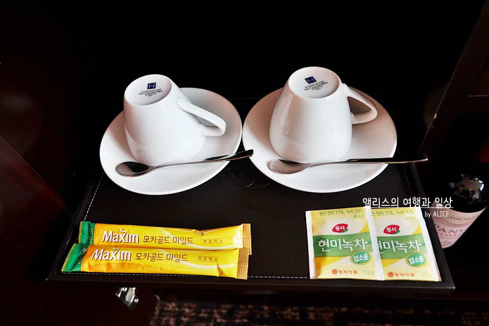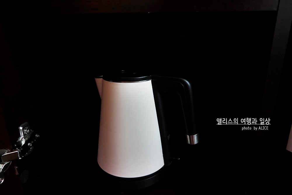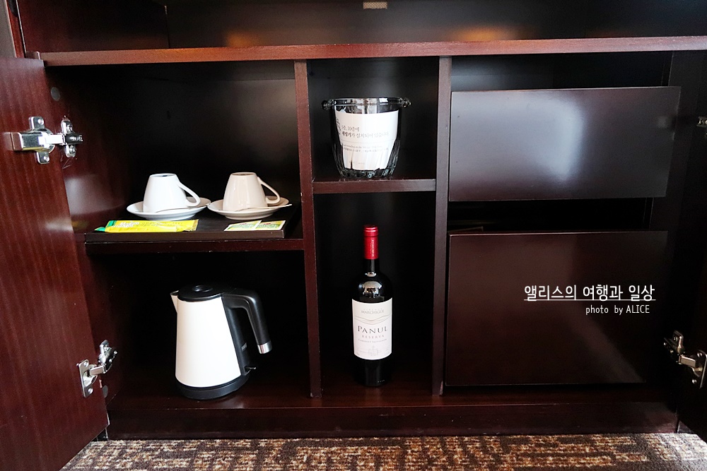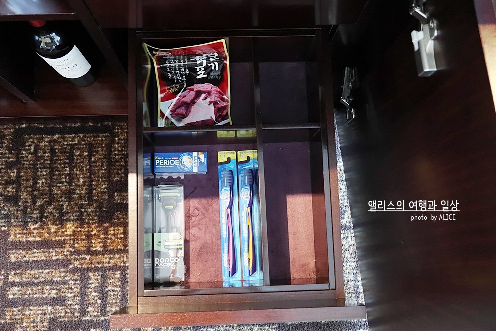 기본적인 티메이커(전기주전자, 믹스커피, 현미녹차티백), 유료판매 와인, 얼음을 담는 통 하나. 그리고 머그컵과 와인잔, 유로판매 칫솔/면도기등이 있다.