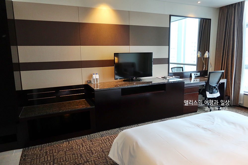 딱 입장하자마자 공간이 넓고 크다는 것을 바로 느낄 수 있었는데, 이곳에서 지내다보니 체감하기에도 넓다는 것이 새삼스레 느껴졌다. 특히 침대와 창문사이, 침대와 오른쪽 벽 사이, 침대와 TV사이, 복도 공간등 사진에서도 느껴지듯이 실제로 이곳에 입실하면 그 넓은 공간을 제대로 체감할 수 있다. 여행가방 테이블도 넓은데, 바닥에 여행가방을 펼쳐놔도 걸어다니는 데 아~무런 문제가 없을 정도.