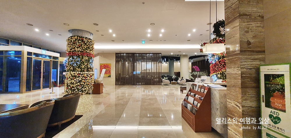 로비에 들어서자마자 넓은 기둥에 화려하게 둘러싼 크리스마스 트리장식들이 눈에 들어왔다. 그 덕분인지 넓은 로비가 화려하면서도 따뜻한 분위기로 가득 채워진 것 같은 기분이 들었다. 총 세개의 기둥이 있는데 그 기둥 모두 이렇게 가득 채워진 트리 장식에 반짝이는 오너먼트등이 인상적이었다. 볼 수록 예뻐서~