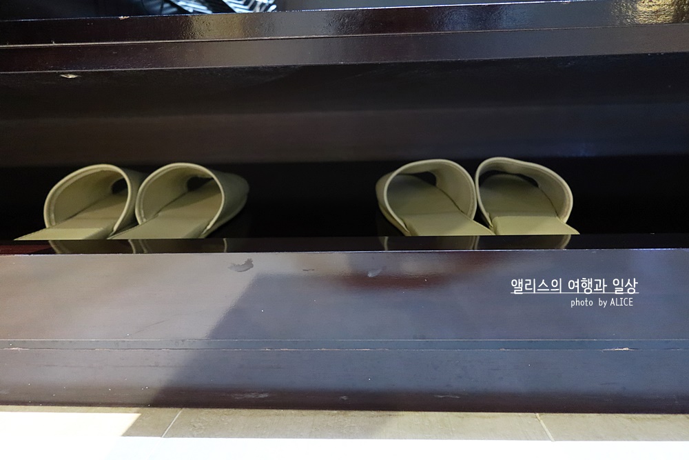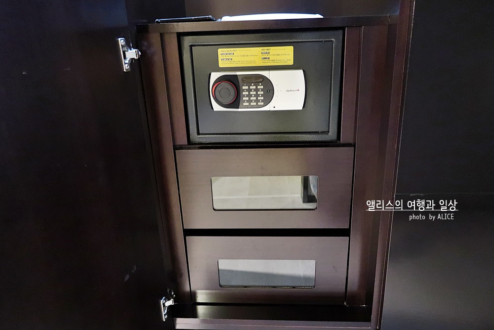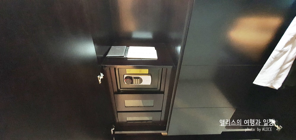 옷장은 총 2칸으로 나뉘어져있다. 작은 칸과 큰 칸으로 분리되며, 작은 칸에는 옷걸이 봉이 있고 그 아래 금고가 있다. 금고 아래 수납장이 있는데 수납공간이 충분하다. 큰 칸에는 배스로브와 옷걸이가 따로 있는데, 공간이 넓어서 두꺼운 외투를 넣어도 공간이 여유로웠따. 그 아래 구두를 손질할 도구가 있고, 가장 아래에 실내화를 두는 공간이 따로 있다.