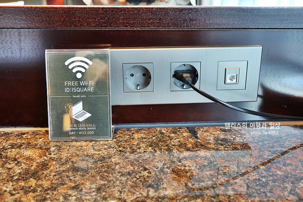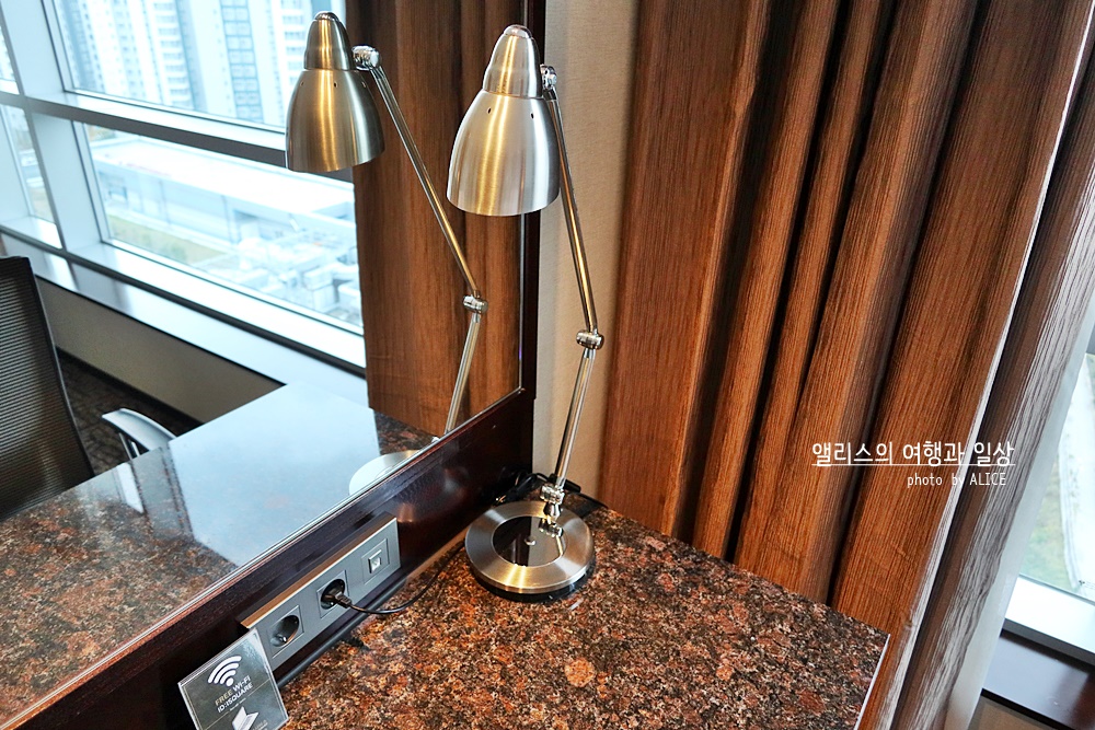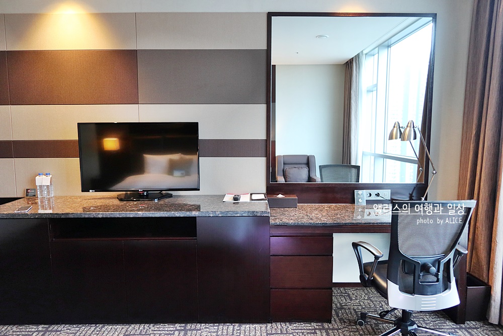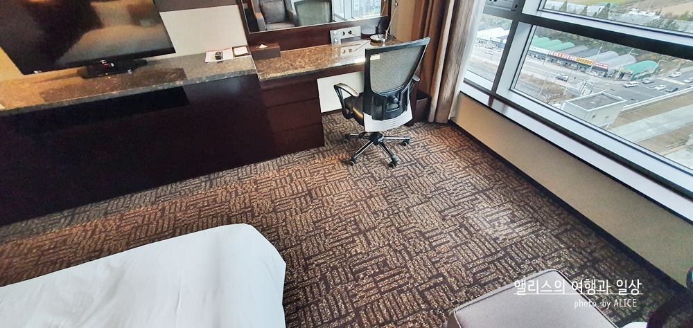 워케이션 호텔 고민한다면, 진짜 다른 곳은 내가 가보진 못했지만 김해 아이스퀘어 호텔의 경우 이렇게 가장 기본 카테고리 객실에도 책상이 넓고 깔끔해서 정말 추천하고 싶다. 사실 아이스퀘어몰과 호텔이 2층에 연결되어 있어서 식사도 쇼핑도 한 번에 가능하다는 것도 엄청 장점이었다. 그런데 내부 객실 역시 일하기에 아주 편리했다.