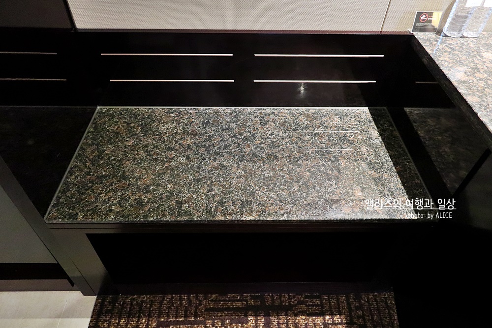 여행가방을 차곡차곡두면 중 사이즈 2개 소사이즈 3개, 대 사이즈는 하나 두고도 남는 공간이었다. 대리석 공간이라 오염에 강하고 스크래치에도 강하니 위생적으로도 관리가 가능하다. 내가 지금까지 봤던 여행가방 테이블 중 가장 마음에 드는 공간이었다.