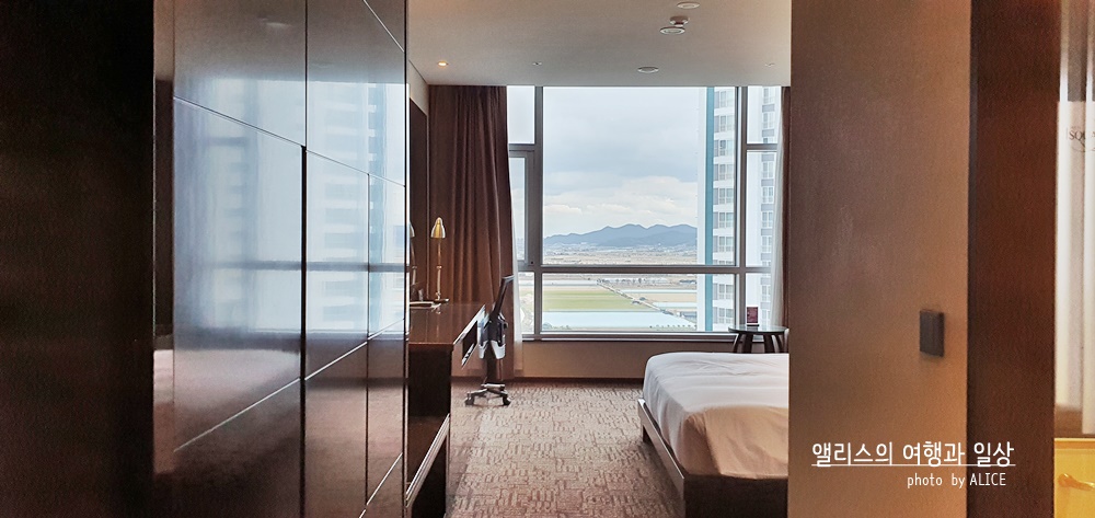 객실문을 열자마다 가장 놀란 점은 넓은 공간이었다. 보통 객실키를 디지털도어락에 두면 자동으로 열리고 문을 (밀던지 당기던지) 열면 좁은 복도형태가 보이는 것이 일반적이었다. 아주 넓은 스위트룸 급 정도가 아닌 이상에야 대부분의 각 호텔의 기본 카테고리 객실은 그렇게 입장하면서 둘러보게 된다. 그런데, 김해 아이스퀘어 호텔은 달랐다. 문을 열었는데, 열자마자 내 눈에 띈 복도공간이 넓었다. 의자 2개 정도 두어도 여유가 나올 정도로.