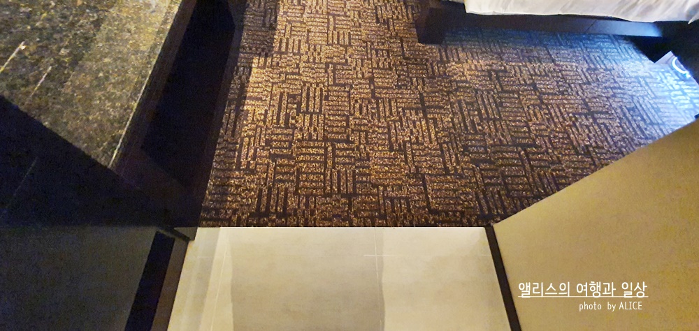 문을 밀고 들어간 뒤 바닥을 보니 복도와 침실 공간은 바닥으로 분이되어있었다. 복도는 돌과 같은 무광대리석 형태였고 침실은 카페트로 구분되었다.