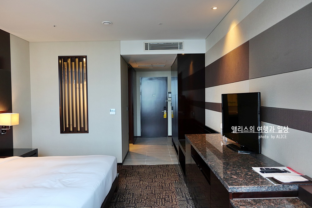 이게 가장 놀라운 일이었다. 가장 기본 카테고리 객실임에도 "32.34m²"의 공간이었다. 와.... 보통의 호텔들은 평균적으로 이정도 크기가 나오려면 적어도 2.5~3단계 이상은 올라가야 나오는 공간크기인데 김해 아이스퀘어 호텔은 기본 카테고리부터 객실 크기가 남달랐다. 그러니까 이 호텔은 슈페리어 객실이 없고 바로 디럭스부터 객실이 있다.