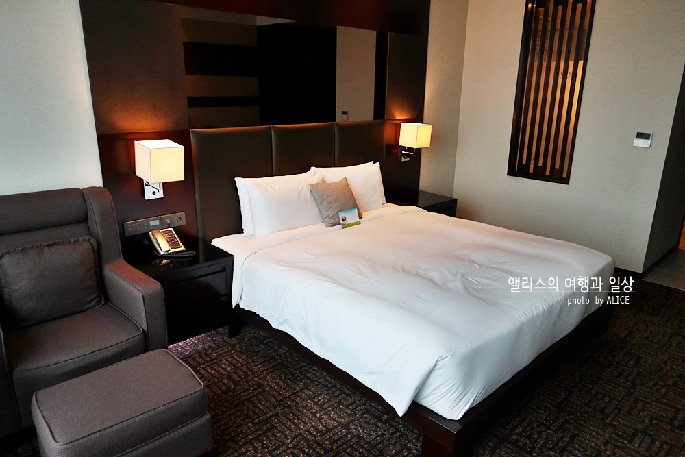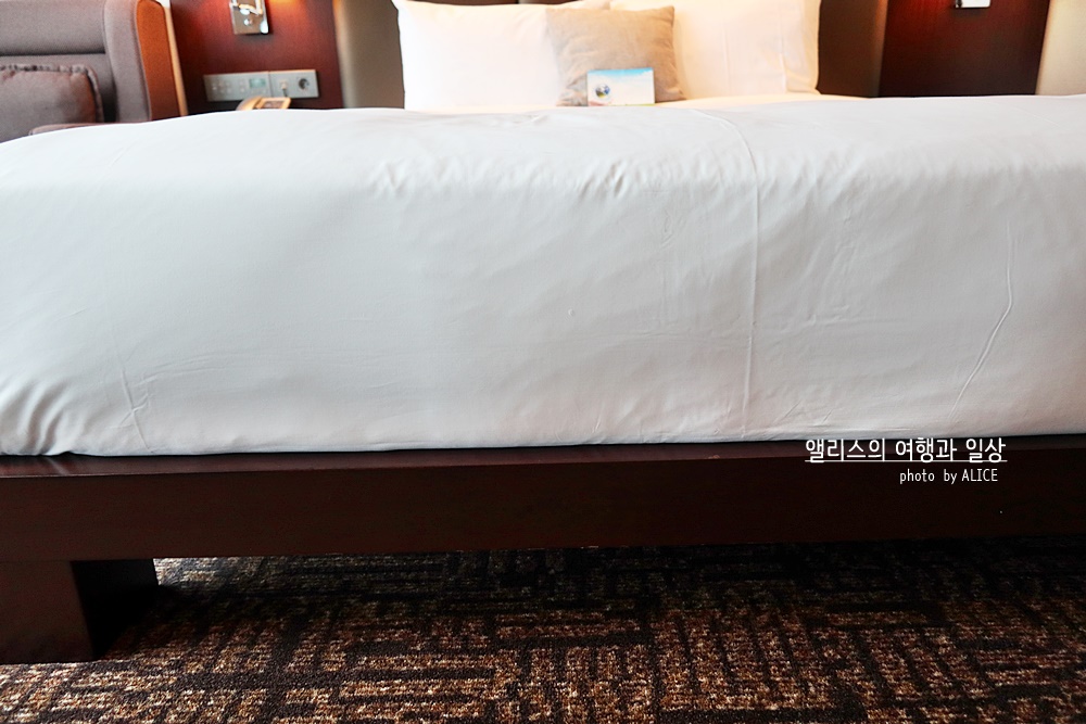 침대의 높이는 너무 높지 않은 적당한 높이. 프레임은 나무로 된 형태라 안정적인 것이 특징이다. 보통 더블베드는 그리 넓지 않은 경우가 많은데, 객실이 넓은 만큼 더블베드도 꽤 넓은 편이라 성인 2명이 자기에 충분한 여유가 있었다.