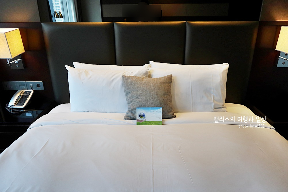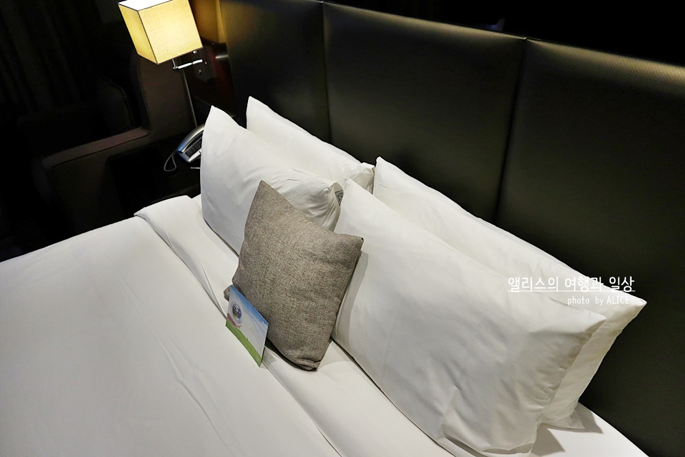 보통 침대를 높이기 위해서 침대 밑에 새로운 매트리스를 올리는 호텔들도 있는데, 이게 잘못되면 너무 흔들리는 효과를 주기 때문에 오히려 잘 때 움직이면 불편할 수 있는데 굳이 그렇게 까지 하지 않은 침대 세팅이 마음에 들었다. 베개는 적당히 단단한 편이라는 점, 그래서 하체순환을 위해서 다리를 여유베개위에 다리를 올려두고 자는 나에게 딱 알맞았다. 머리를 두고 자기에도 적당히 단단히 잡아주는 점도 좋았다.