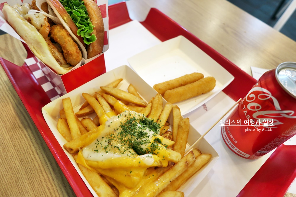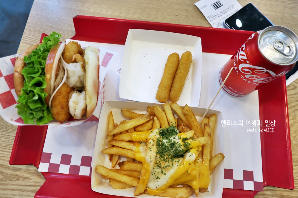 ■ 직화 통 새우버거, 오지치즈감자튀김, 치즈스틱, 콜라 캔