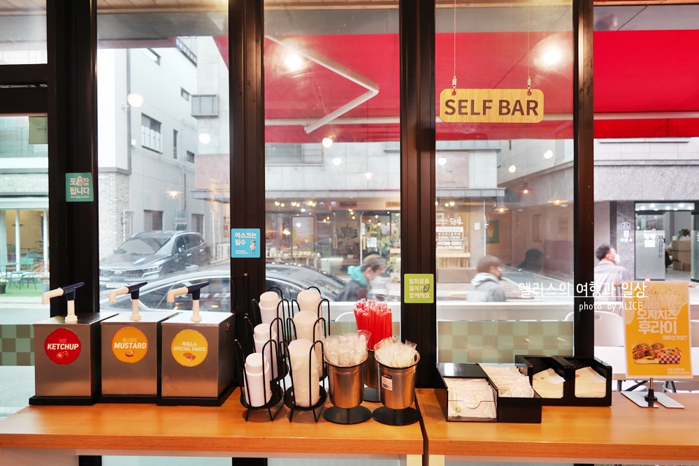 셀프시스템에 맞게끔, 감자튀김이나 기타 소스도 따로 원하는 만큼 셀프바에서 덜 수 있다. 물티슈와 휴지와 필요한 플라스틱 스푼등도 필요한 만큼 셀프바에서 챙기며 된다.