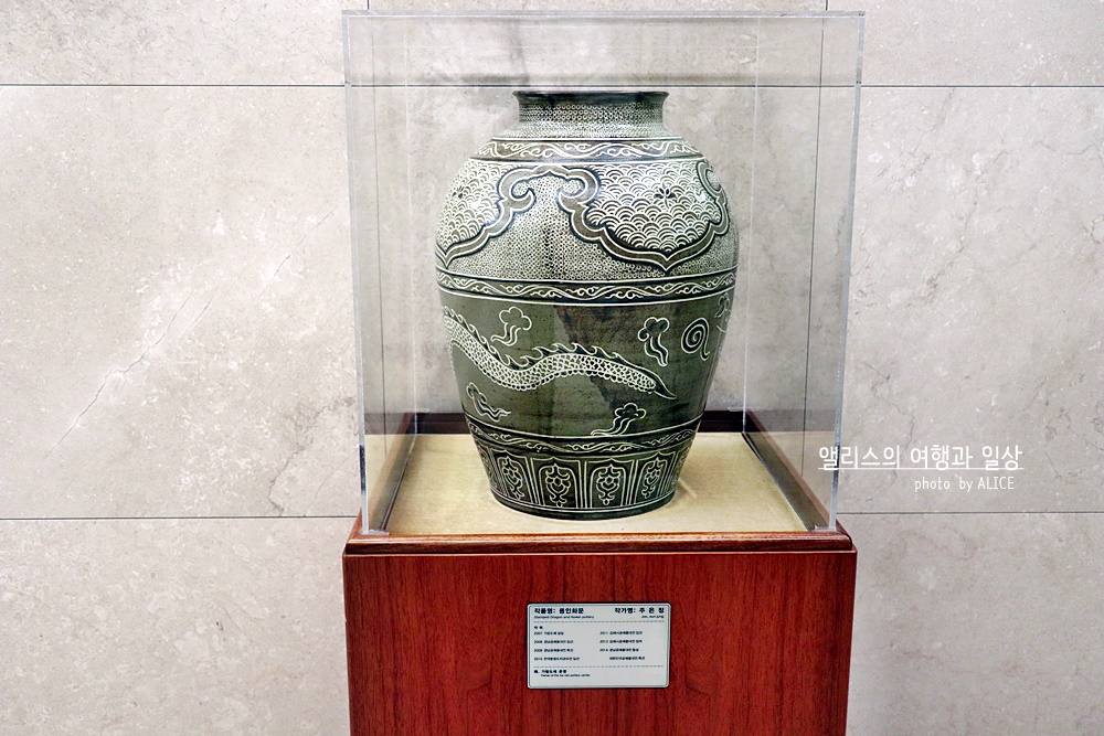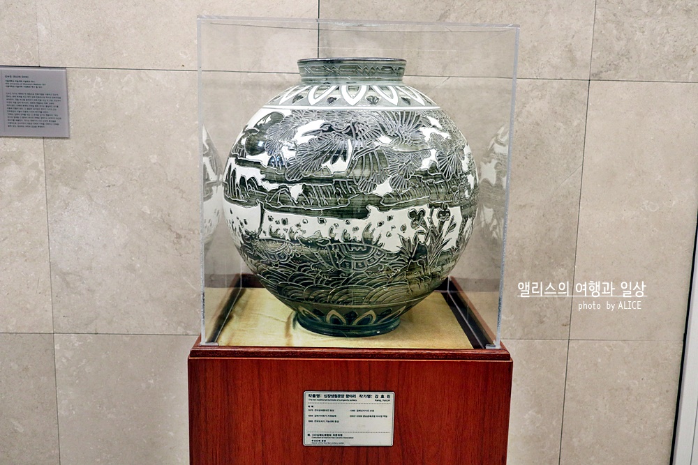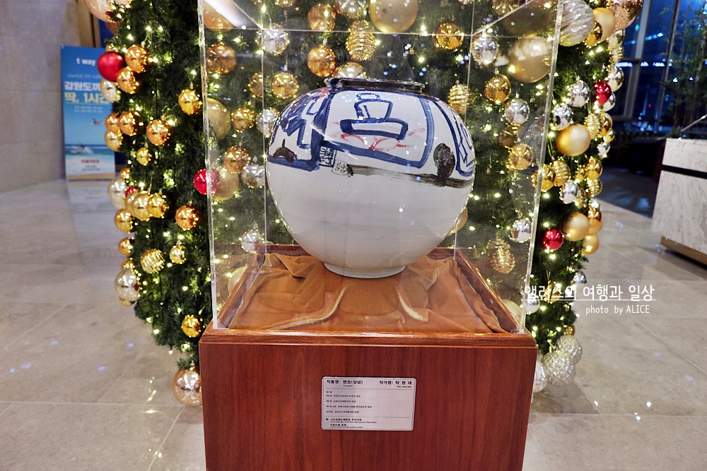 다시 호텔로 돌아와서, 김해 아이스퀘어 호텔 내에는 도자기 작품을 볼 수 있다. 거대한 분청도자기들은 각 작가들의 개성을 살린 멋진 그림과 함께 전시되어있다. 호텔에서 잠시 여유를 가지고 이 도자기들을 보고 작가와 작품이름을 보며 어떤 초연의 마음을 담아냈는지 관심있게 보다보면 시간가는 줄 모른다. 피트니스 센터/주차장 가는 엘리베이터 앞에는 여러 작품이 한데 모여있다. 얼핏 그냥 지나칠 수도 있지만 또 잠깐 시간내서 보다보면 지겹게 느껴지던 엘리베이터가 금새 도착하기도 한다. 이 덕분에 이 호텔에 발을 들이는 순간부터 아, 이 호텔은 은근히 세세하게 신경을 많이 쓰는 곳이겠구나 싶었다. (그리고 이것을 조식에서 다시 한 번 체감할 수 있었다. 조식에 대해서는 이 글 아래에 정리해둠)