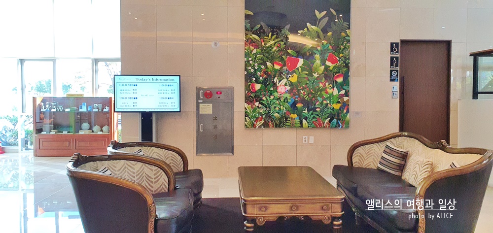 그런 점에서 김해 아이스퀘어 호텔은 만족스러웠다. 로비 곳곳에, 엘리베이터 탑승하는 장소에도 작품들이 전시되어있었기 때문이다. 내가 왜 이런 부분에 스스로 호텔에 대한 점수를 높이 주냐면...... 그것은 바로 돈이 들어가기 때문이다. 생화든 조화든 관리와 비용의 차이는 있지만 어쨌든 그것들을 들여놓는다면 돈이 들어간다. 크든 작든, 유명하든 아니든 작품을 호텔에 둔다는 것은 그만큼 그 호텔이 돈을 투자하고 있다는 것을 의미한다. 그런 점에서 김해 아이스퀘어 호텔은 비록 고객의 눈에 대단히 크게 띄지 않다고 해도 곳곳에 작품을 전시해두고 있었다. 그것도 김해의 시그니처이자 정체성을 나타내는 작품으로!
