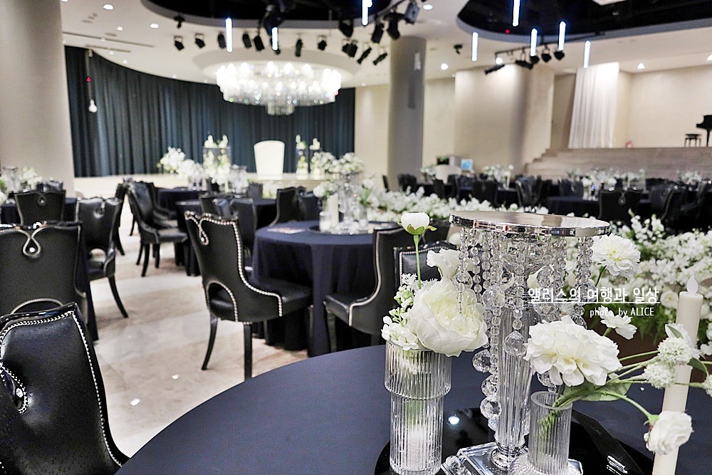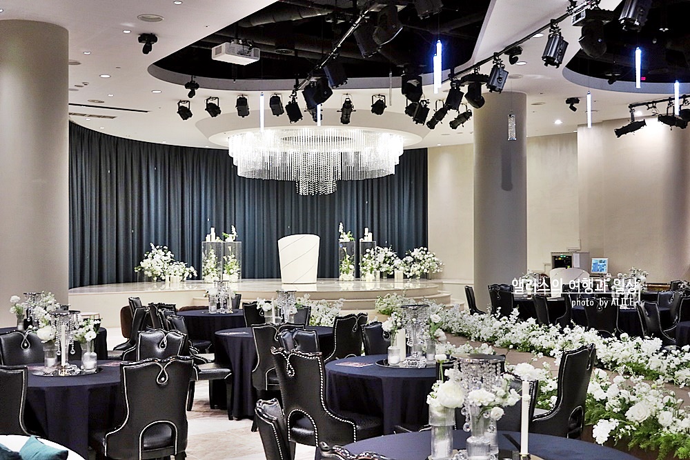 김해 아이스퀘어 호텔은 많은 이벤트를 소화하는 호텔 중 하나이기도 하다. 그 중 대표적인 이벤트라면 뭐니뭐니해도 웨딩. 우리에게 익숙한 대규모 그랜드 볼룸 홀도 있기는 하지만, 이렇게 예쁘게 극장식 형태의 콘서트홀에서도 웨딩이벤트를 진행할 수 있다. 기존 전통적인 화려한 호텔 웨딩싱도 가능하지만, 이렇게 어디에도 없는 극장식 형태로 나를 축하하러 해준 모든 이들에게 특별한 경험을 전달할 수 있는 이 장소는 솔직히 보자마자 반했달까. 버진로드도 하얗게 핀 꽃으로 데코레이션 되어있어서 정말 화려했지만, 무엇보다도 전반적인 분위기가 아늑한 크리스탈처럼 투명한 분위기라서 정말 특이하고 좋았다.