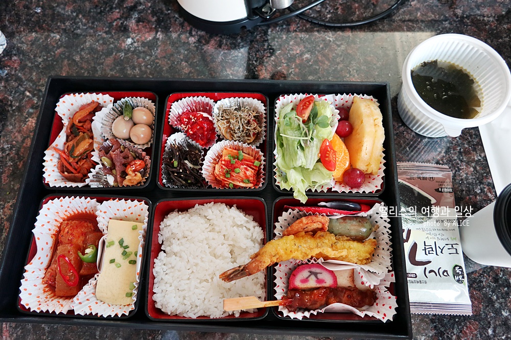 이것은! 솔직히 말해서 조식뷔페에 크게 다르지 않은 느낌의 조식 도시락.