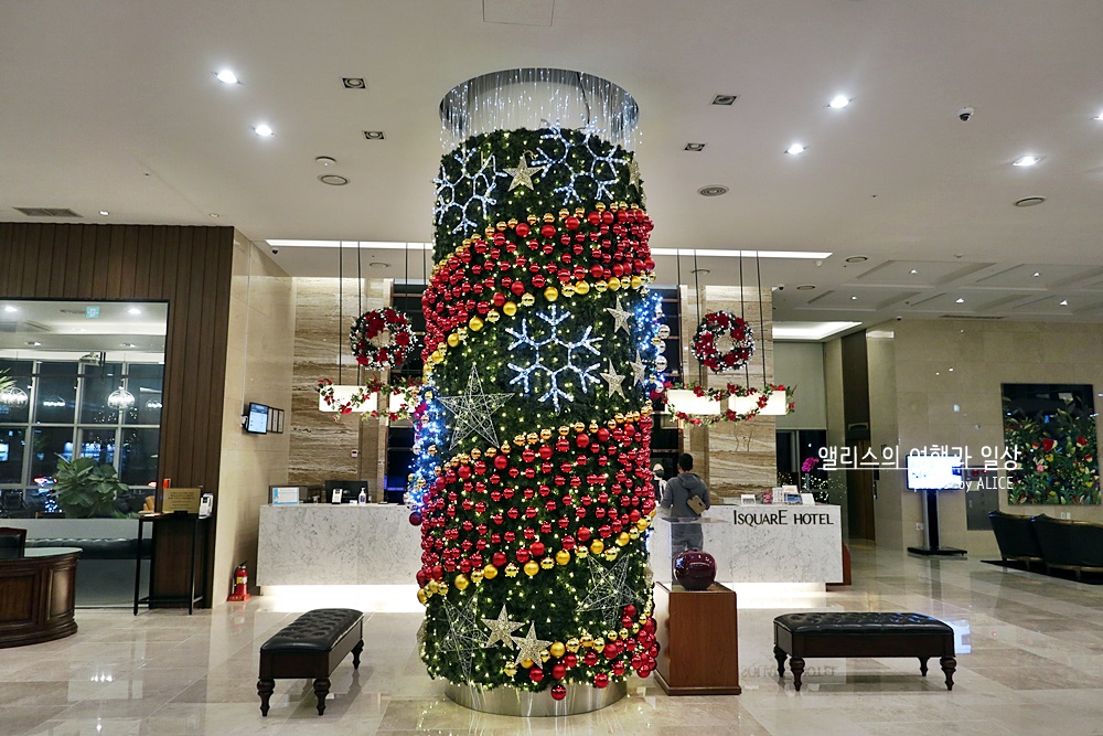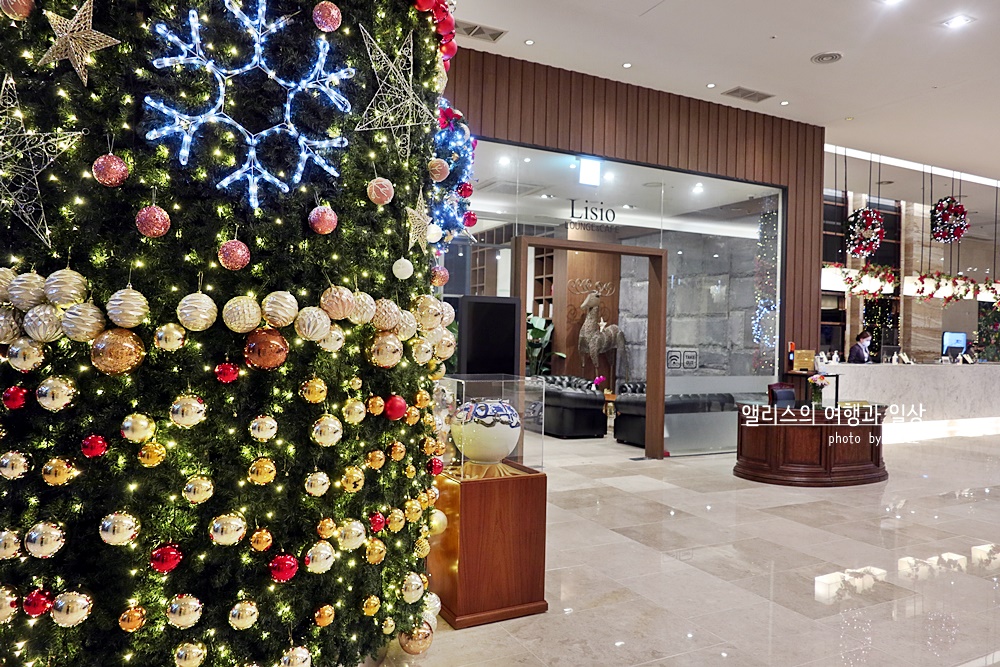 오너먼트가 화려한 거대한 기둥 3개가 있는 로비. 그래서인지 유독 더 따뜻한 시즌을 느낄 수 있었다.