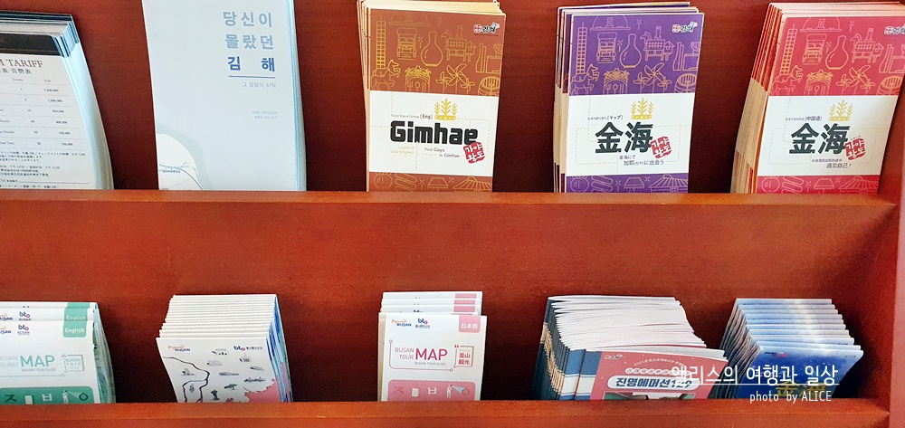 프론트 오른쪽에 이렇게 팜플릿이 모여있다. 언어는 총 세개정도 별도로 있으니 참고해볼만하다. 참고로 김해시관광에서는 따로 가이드북을 무료로 제공하니 핸드폰에 담아두고 싶다면 그렇게도 가능하니 참고하자.