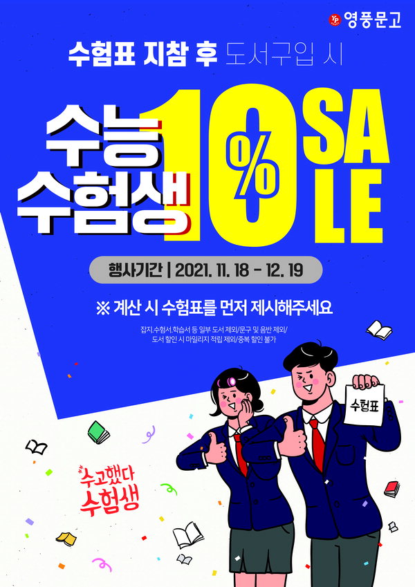 - 기간 내 도서를 구입시 수험표를 제시하면 구매 금액의 10%를 할인 (단, 잡지, 수험서, 학습서 등 일부 조서가는 할인 대상에서 제외)
