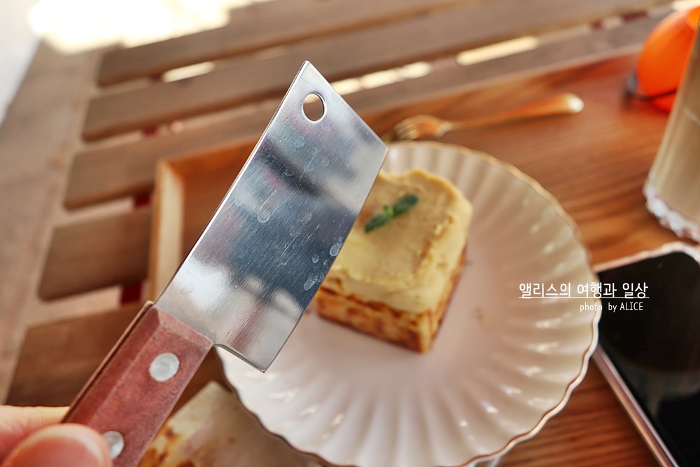 군고구마 케이크를 먹겠노라 살펴봤더니 작은 사각형 칼이 있다. 이게 왜 필요한 걸까 싶었는데... 단 번에 알 수 있었다. 엄청나게 쫀득한 군고구마 케이크를 반을 가르려면 이 귀여운 칼이 필요하다는 사실을! 귀여운 칼로 반을 나눈 뒤 포크로 조금씩 한 입씩 나눠 먹었다. 진하게 밀려 들어오는 그냥 고구마 아닌 군고구마 맛 그대로. 여기에 치즈까지 부드럽다. 내가 먹은 고구마 케이크 중에 역대급 1위로 테를지 군고구마 케이크가 올라섰다. (2위는 투썸의 고구마케이크인걸로!)