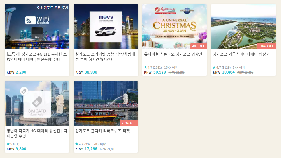 방콕은 4G LTE 와이파이 대여, 태국 방콕 PCR 검사, 방콕 마사지, 방콕 격리 호텔 SHA(4성급)+공항픽업+PCR검사 패키지까지 단 번에 구매해서 이용가능하다. 싱가포르는 프라이빗 차량 투어, 유니버셜 스튜디오 싱가포르 입장권, 싱가포르 가든스바이더베이 입장권 등이 있다. 모두 인기 많은 싱가포르 여행 상품이다. 하와이는 락카훌라 디너쇼, 하와이 돌핀크루즈, 선셋디너, 해양스포츠 패키지 등이 판매되고 있다. 하와이를 그대로 느낄 수 있는 상품들이다.