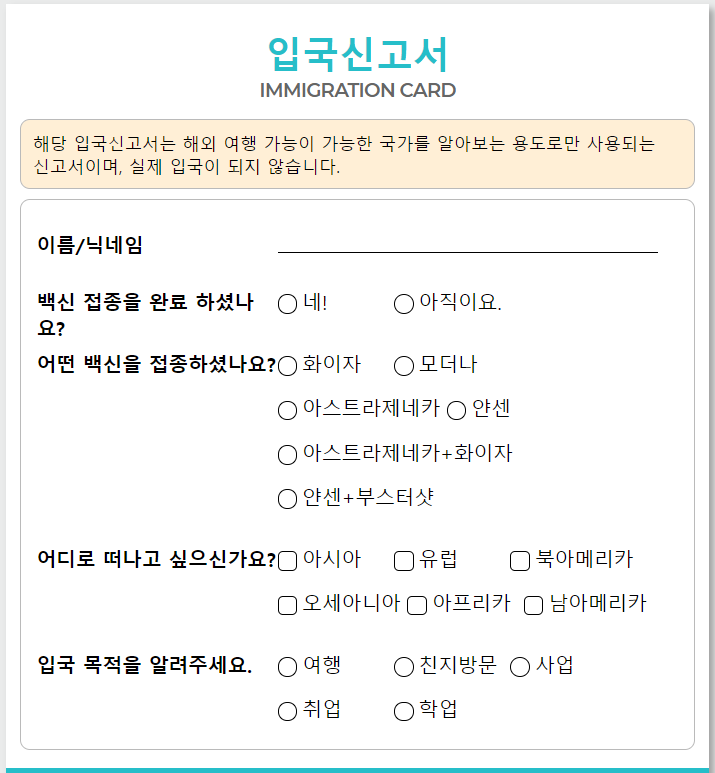 입국신고서를 작성하면, 격리없이 여행 가능한 국가를 자동으로 추천해주는 이벤트로, 내가 가진 조건으로 무격리 가능한 여행지를 간편하게 찾을 수 있다. 나의 결과는 어디일까?