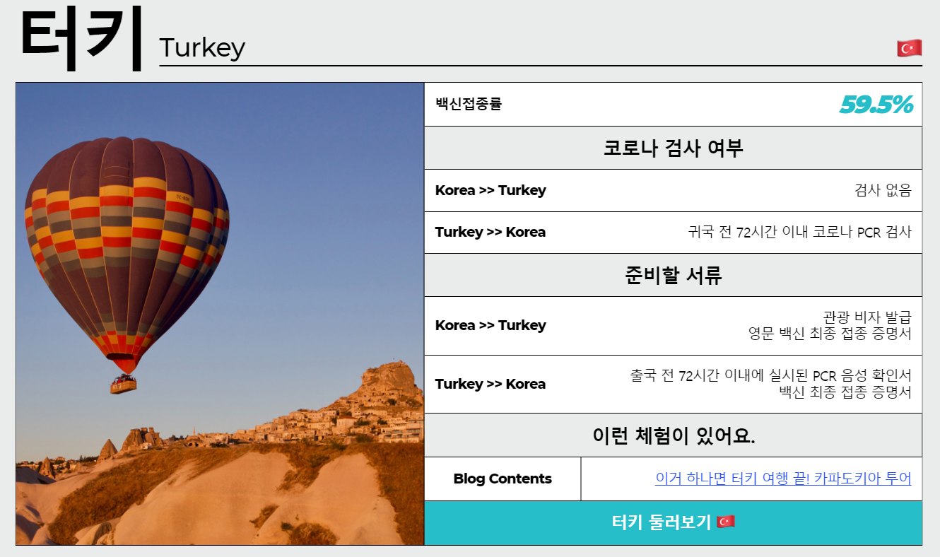 내가 추천받은 무격리가능 여행지는 "터키"였다. 터키는 아주 오래전 방문했었던 나라 중 하나. 직접 가보았지만 그때 당시 기록한 내 카메라 메모리를 분실해버리는 바람에 남은 사진은 없지만 내 추억에 남아있어서 다시 가보고 싶은 곳이기도 하다. 어느 지역으로 무격리가 가능한지 하나하나 찾기가 불편하다면, kkday의 테이크 유어 패스포트 아웃 프로모션을 이용해보자. 이걸 직접 해보니 해외여행이 그리운 나에게 조금은 설레임을 주기도 했다.