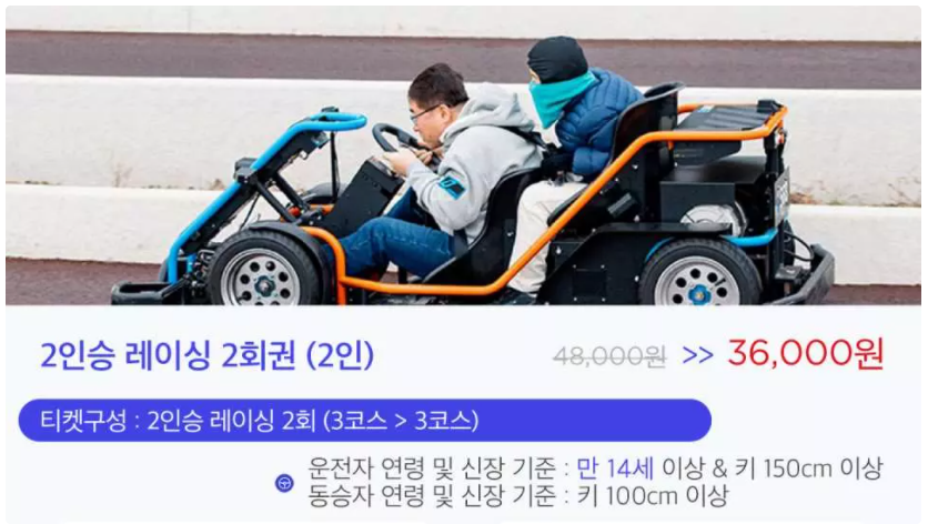 ② 2인승 레이싱 2회권 48,000원 → 36,000원 (약 25% 할인!)