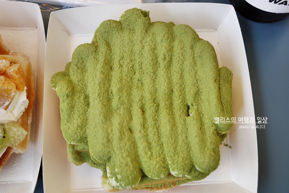 이역시 칼로 적당한 크기로 잘라서 크림을 잘 잡아 한 입먹으면 입안에 퍼지는 말차가루와 티라미수 크림들. 와플과 잘 어우러진다.