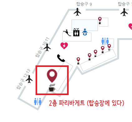 비행기를 탑승하는 탑승장, 그러니까 비행기 표와 신분증을 검색직원에게 보여주고 내 짐을 검색하고 난 뒤에 들어가는 탑승장 2층에 파리바게트가 있으며, 각 항공사 카운터가 있는 출발장, 그러니까 우리가 여행짐(위탁수하물)을 맡기고 비행기 표를 뽑는 키오스크가 있는 출발장 3층에 파리바게트가 있다.