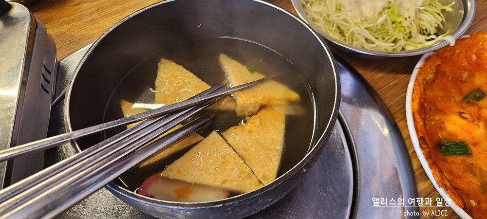 · 김치전, 양배추샐럳, 오이무침, 어묵탕, 번데기