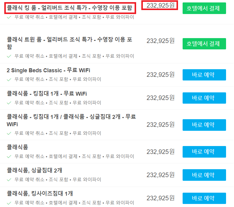 조식 2인을 포함한 가격을 확인해보자. 가격비교 사이트에서 최저가는 232,925원이다. 성인 2명 포함된 걸 생각하면 이 가격도 상당히 합리적인 가격이라고 본다. 하지만 kkday 호텔 타임세일을 통해서 예약하게 되면 기본 룸+조식 2인은 199,000원++레드와인 1병+12시 체크아웃으로 예약 가능하다.