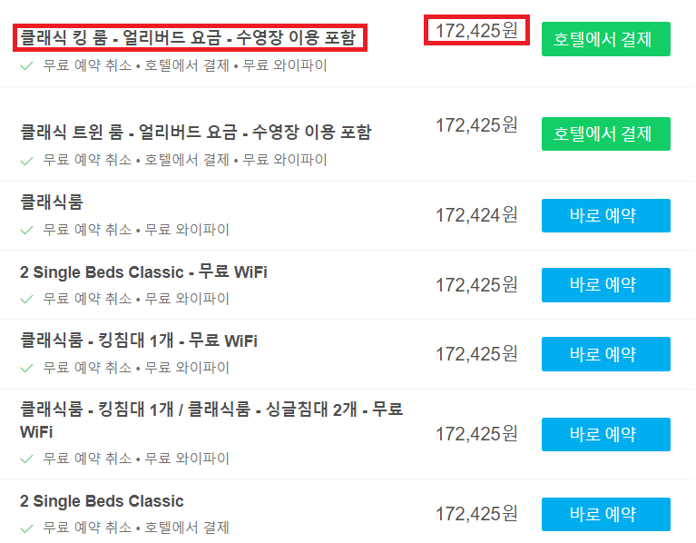 위 호텔 가격비교 결과를 보면 알 수 있듯이 가장 기본 객실 요금 1박은 최저가 172,452원. 물론 추가 혜택은 없다. 하지만 kkday 호텔 타임세일을 통해서 기본 객실 예약하면 179,000원+14만 원 치 미니바+레드와인 1병+12시 체크아웃(주중 기준) 혜택 몽땅 받을 수 있다.