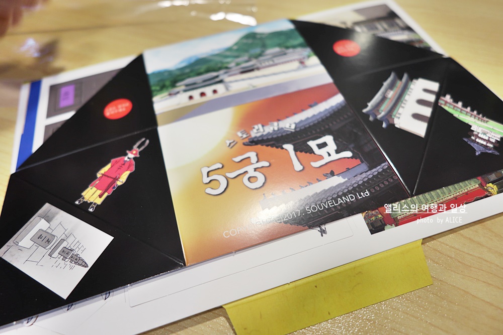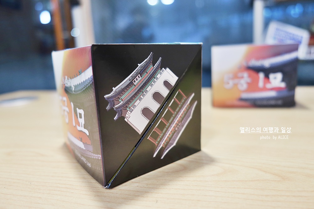광화문 거리 만들기를 다 하고 나니 실제 예정된 체험시간이 많이 남았다. 팝업북 제작자 선생님이 나의 손재주가 빨라서 그렇다고 칭찬해주셨다. 그래서 다른 거 해보고 싶은 거 있냐고 하셔서 수브랜드 가게에 전시된 팝업북 중 5궁1묘를 만들기를 선택했다.