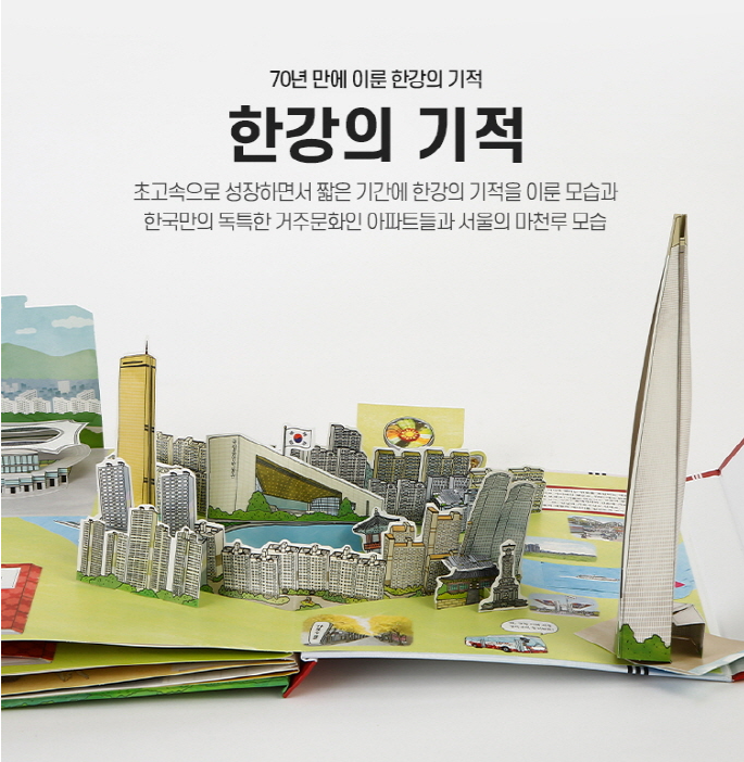 한강을 따라 서울을 대표하는 건물과 장소 등이 표현된 팝업북이다. 특히 한강에는 빠르게 이동하는 수상택시 또한 표현되어있다.