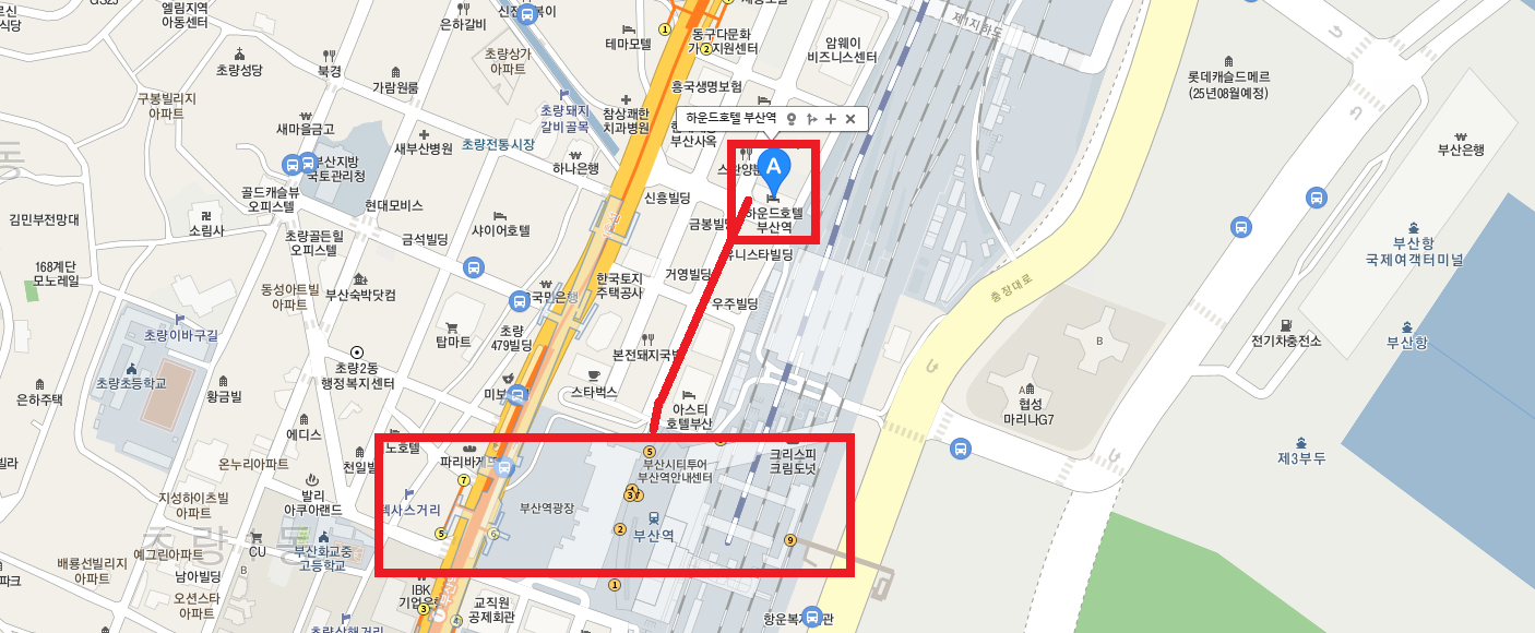 · 부산역 또는 부산역 지하철역에서 도보로 5분 이내 이동 가능