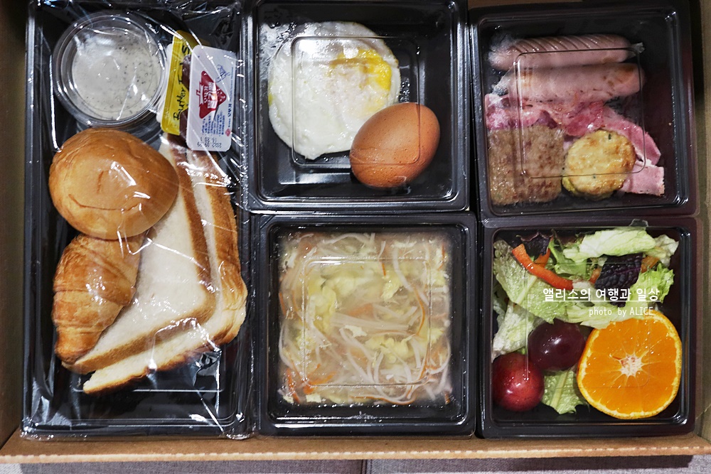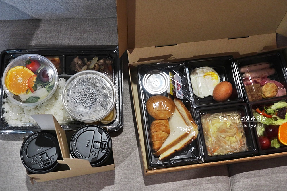 나 역시 하루 전날 조식을 신청했는데 궁금해서 <미국식, 한국식 조찬 2가지를 신청>했다. 둘 다 먹고 싶어서... ^^;; 그냥 궁금하기도 했다. 내가 요청한 시각에 객실 문 앞에 직원이 도착했고 벨을 울렸다. 도시락을 받으러 나가니 문 앞에 있던 도시락. 덕분에 비대면으로 도시락 수령이 가능했다.