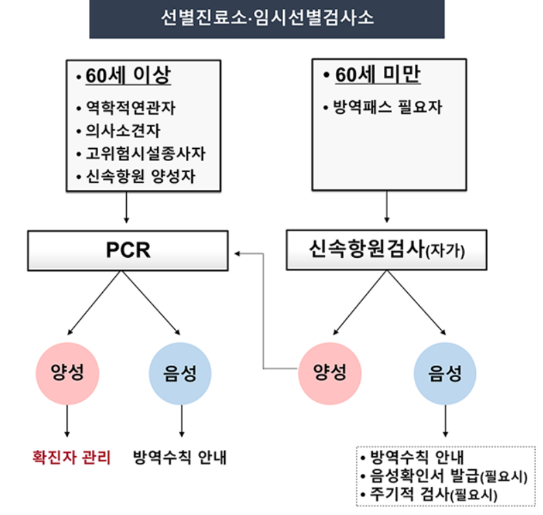 ② 일반 군: 선별 진료소 또는 자택에서 자가검사 키트 → 양성일 경우 PCR 검사 무료 실시 → 양성일 경우 7일 격리 치료