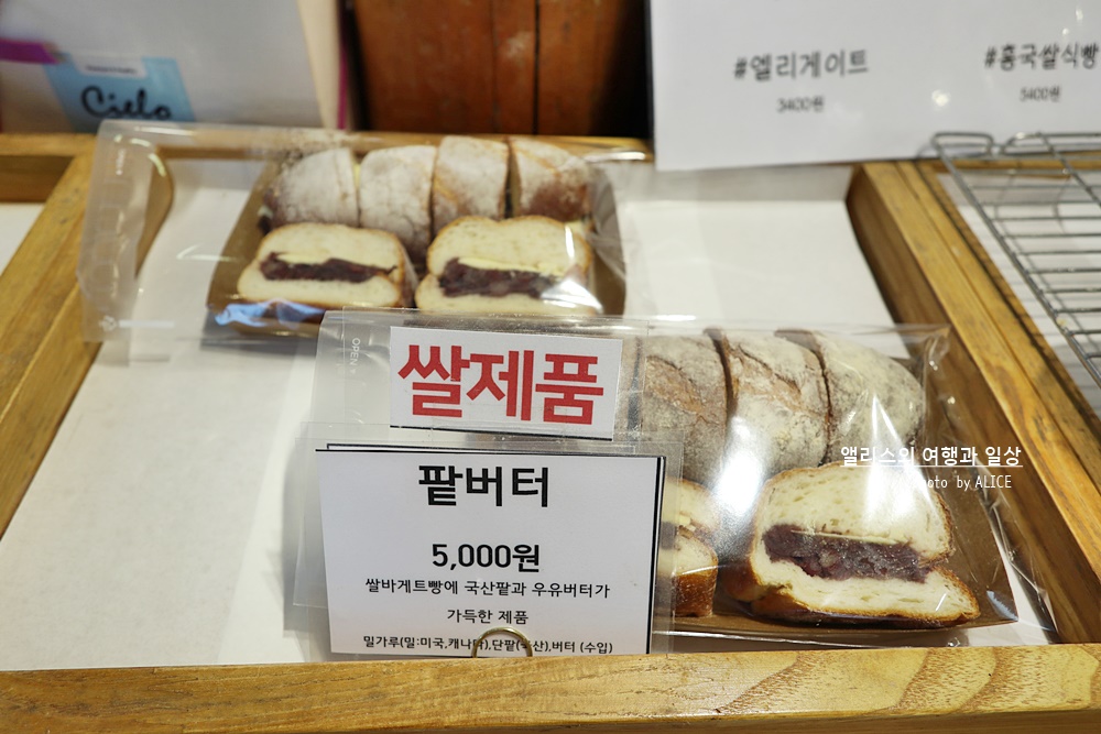 새우바게트의 경우 바게트안에 새우바게트는 시엘로 과자점의 대표 메뉴 중 하나다. 반죽 자체에 건새우를 듬뿍 넣고 구워낸 빵이라 빵 자체가 충분히 맛있다. 그 감칠맛이 느껴지는 빵에 겨자소스+양파로 속을 채웠다. 그러니 맛이 없을 수 없다. 그리고 두번째로 인기많은 것은 역시나 홍국쌀로 만든 단팥빵과 식빵. 홍국은 누룩곰팡이를 발효시킨 붉은 쌀이다. 이걸 밀가루 대신 반죽해서 빵을 만들었으니 그간 속이 불편하다고 했던 사람들도 편하게 먹을 수 있는 빵으로 인기가 많다. 주로 이 메뉴가 잘 나가서 어떤 날은 다 팔려서 구매하 수 없을 때도 있다.
