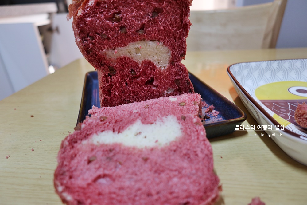 홍국쌀 식빵의 하얀 부분은 찹쌀부분이다. 그래서 유독 쫄깃한 맛이 좋아서 샌드위치로도 좋고 토스트빵으로도 좋고. 그냥 먹어도 좋다. 그냥 한조각 잘라서 전자레인지에 넣고 살짝 데우기만 해도 쫄깃하게 맛나다.