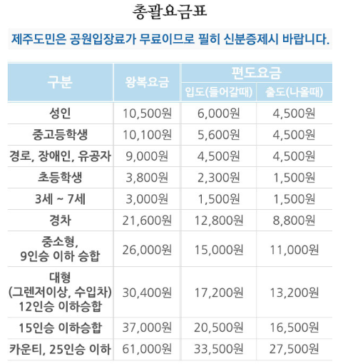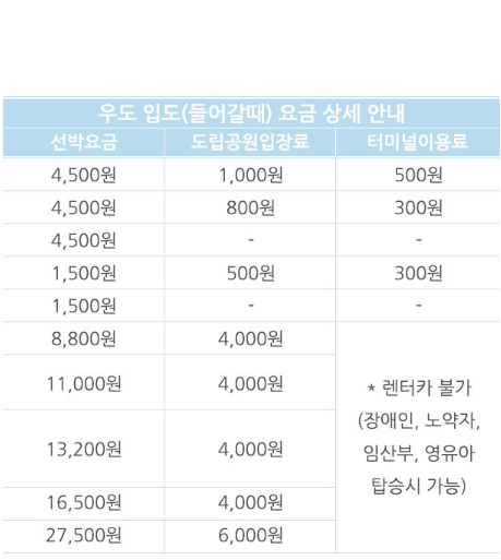 아래 첨부한 우도 배 총괄 요금표는 제주(성산항) ↔ 우도(천진항/ 하우동목항)를 기준으로 정리된 표다. 종달항에서 출발할 경우 아래 요금에서 500원이 적으니 참고하자.