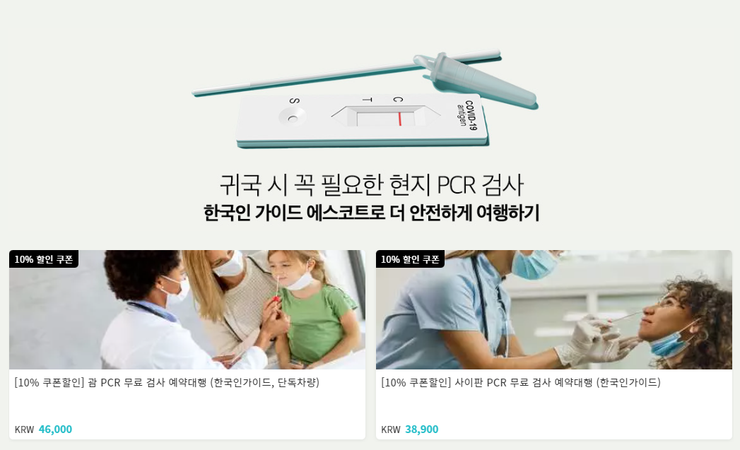 kkday에서 5월 10일까지 사용할 수 있는 괌 & 사이판 할인코드다. 괌 & 사이판 관련 상품은 모두 10% 할인코드, 20% 할인코드를 사용할 수 있는 것이 특징. 특히 귀국시 반드시 필요한 PCR 검사 역시 간편하게 예약가능하다.