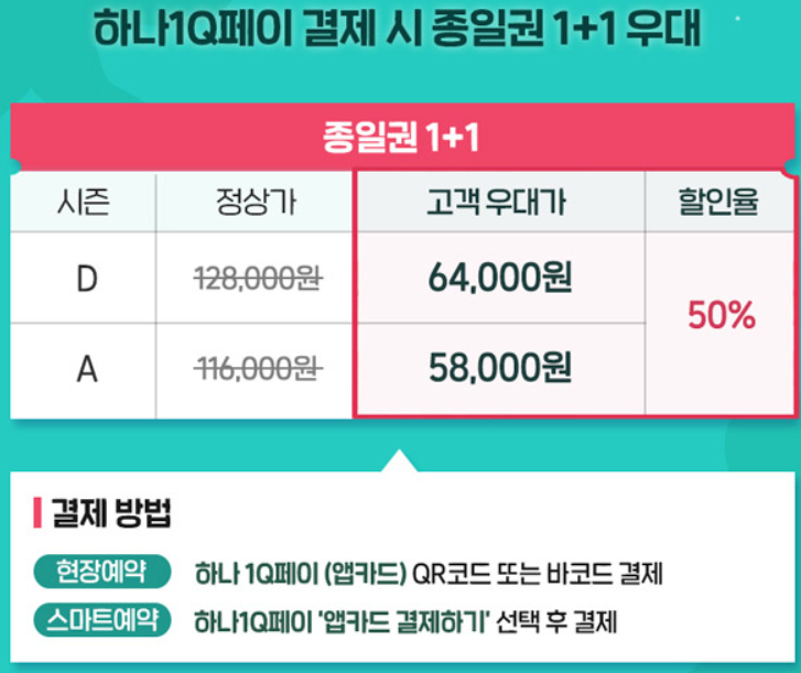 · 방문일 기준 1일 1회 카드 명의자 본인 결제에 한함 (카드사마다 다를 수 있음), 현장 매표소 이용 시 신분증 지참