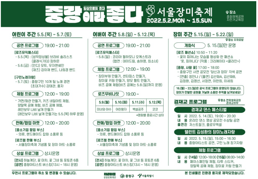 중랑아티스트 버스킹, 구민노래자랑, 로즈뮤직페스타, 로즈뮤비나잇, 등 매일 다양한 공연이 펼쳐지고, 체험 프로그램과 판매/팝업마켓을 운영한다. 이와 관련된 자세한 일정이 궁금하다면 여기 클릭 후 확인하자.