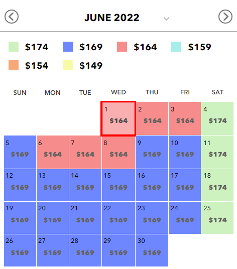위에 정리한 가격은 기본 가격이다. 그러니까 어떤 날짜에 입장하느냐에 따라서 유니버설 스튜디오 할리우드 입장권 가격이 달라진다. 1일 종합이용권의 시작 가격이 공식적으로 109달러이지만 위 달력에서 확인할 수 있듯이 어느 날짜에 입장하느냐에 따라서 가격이 상승한다.