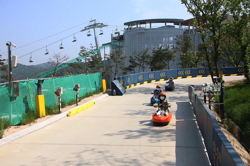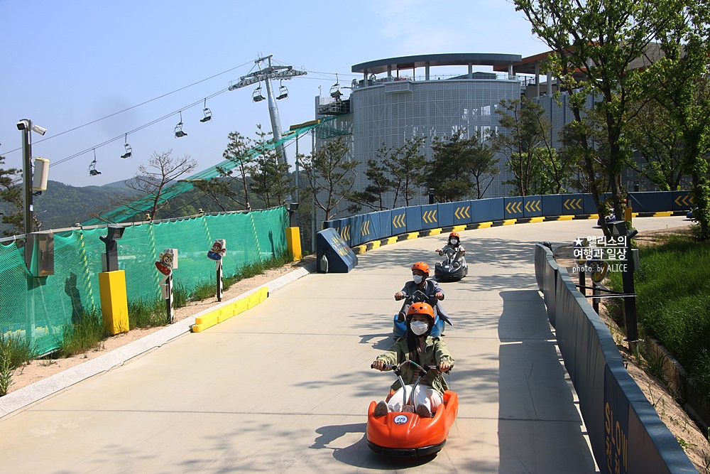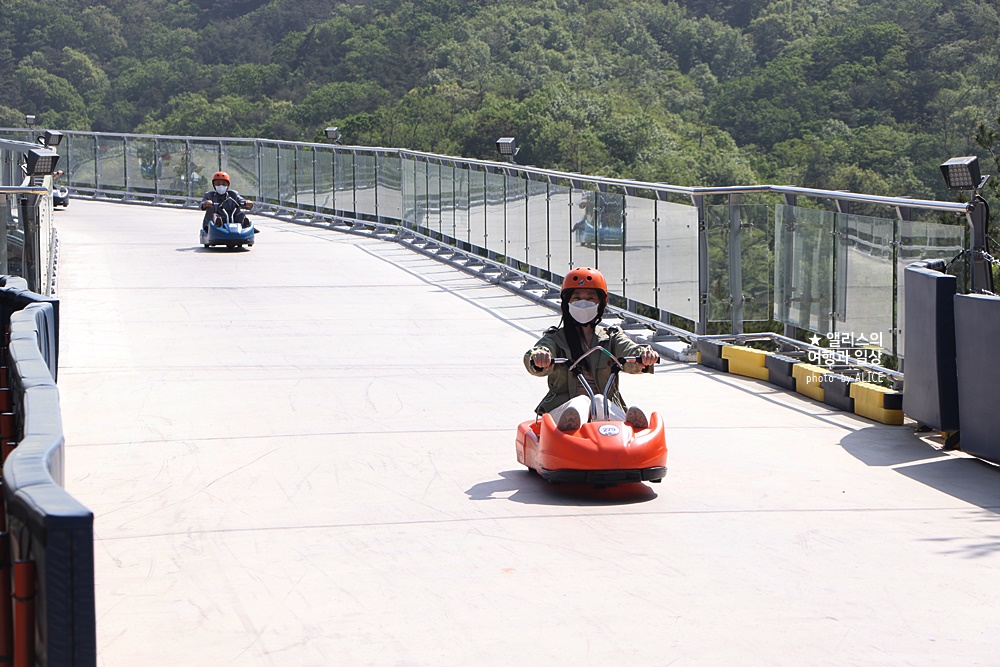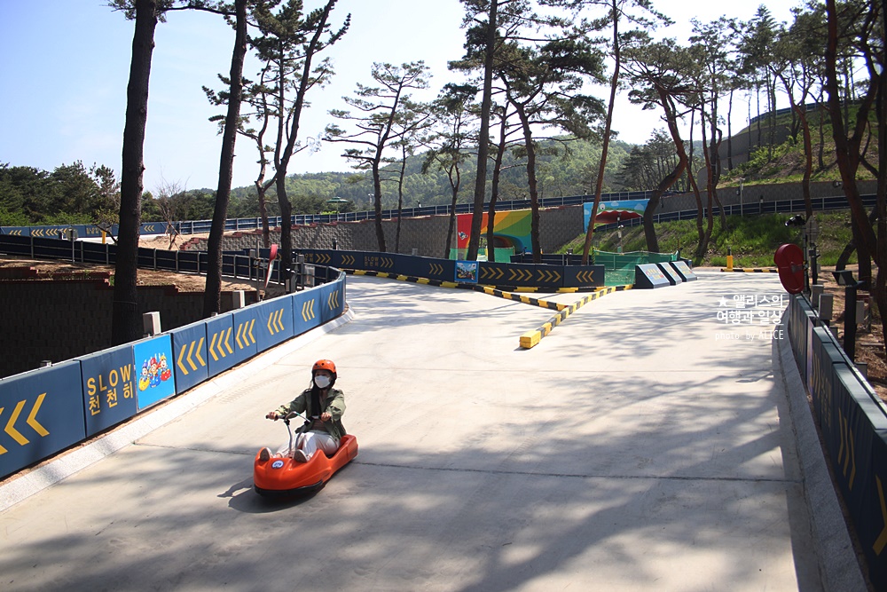 나는 천마 코스를 선택했는데 천마코스를 직접 이용해보니 화랑 코스에 비하면 확실히 스릴감이 달랐다. 경사도 상당한 편이었고 그래서 속도를 얼마든지 낼 수 있었다. 물론 안전 탑승을 생각한다면 경사가 심한 구간에서는 브레이크를 어느 정도 활용하면서 이동해야 한다. 안 그러면 속도가 진짜 정말 빨라진다.