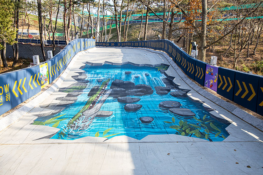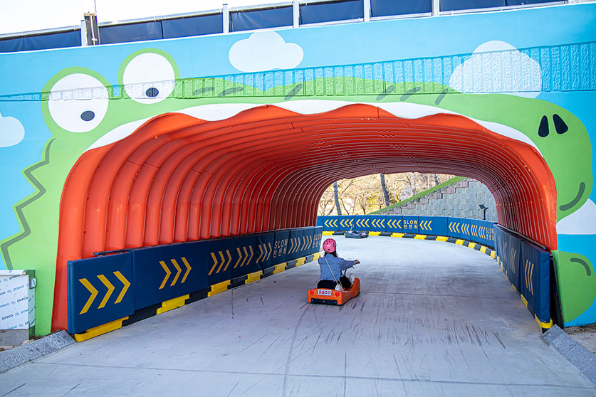 각 코스마다 요렇게 독특한 그림이 있었다. 착시현상이라는 것을 잘 알지만 일순간 그 착시 공간을 지나간다는 것도 재미있었고, 다양한 컬러의 동굴을 지나가는 것도 흥미로웠다. 루지라는 것이 무동력 장치로 이동하는 재미가 있지만 주변 풍경이 좋다면 더더욱 즐겁다. 각 지역의 루지마다 코스를 만들 때 주변 환경을 잘 활용한다. 어떤 곳은 저 멀리 바다가 보이기도 하고 또 어떤 곳은 멋진 숲과 함께하기도 한다. 경주 루지월드의 경우 이런 착시 현상이 중간중간 있어서 흥미로웠다.