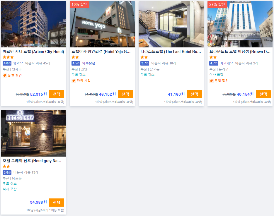 부산 경상지역의 약 30여 개의 호텔이 트립닷컴에서 세일 이벤트에 참여하고 있다. 특별한 노력을 들여 할인코드나 쿠폰을 찾지 않아도 자체 할인된 가격에 업데이트 되어있기 때문에 부산/경상 지역 호텔을 편리하게 예약할 수 있다.