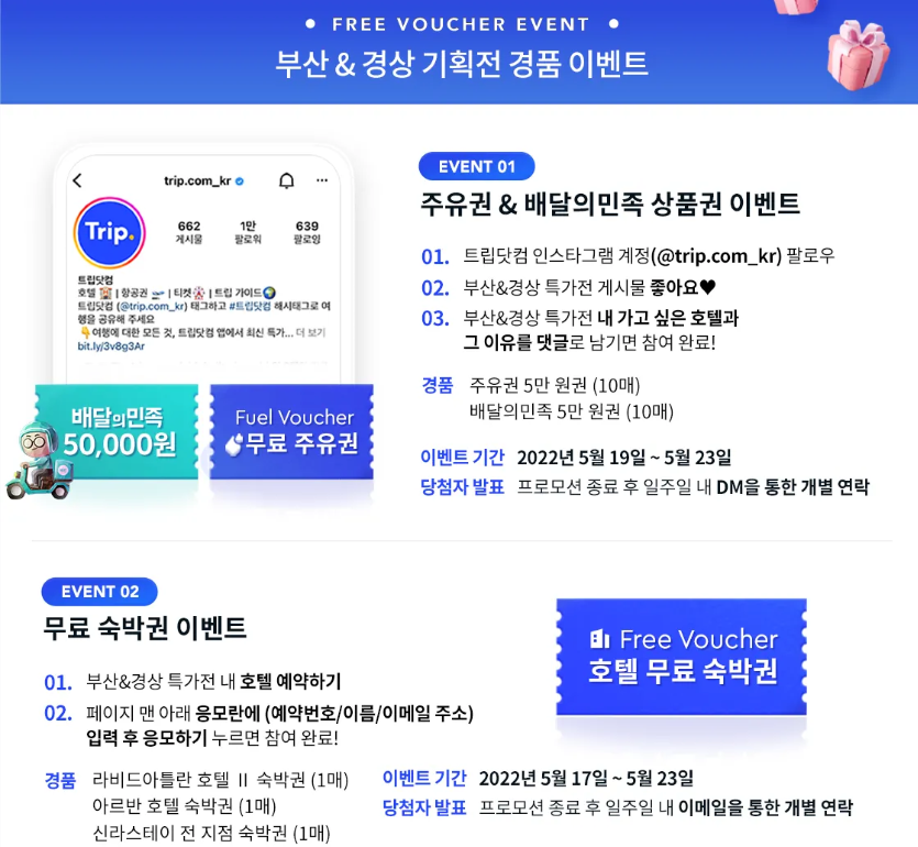 · 참여방법: 트립닷컴 인스타그램 계정(@trip.com_kr) 팔로우 → 부산&경상 특가전 게시물 좋아요 ♥ → 내가 가고 싶은 호텔과 그 이유 댓글로 남기면 참여 완료