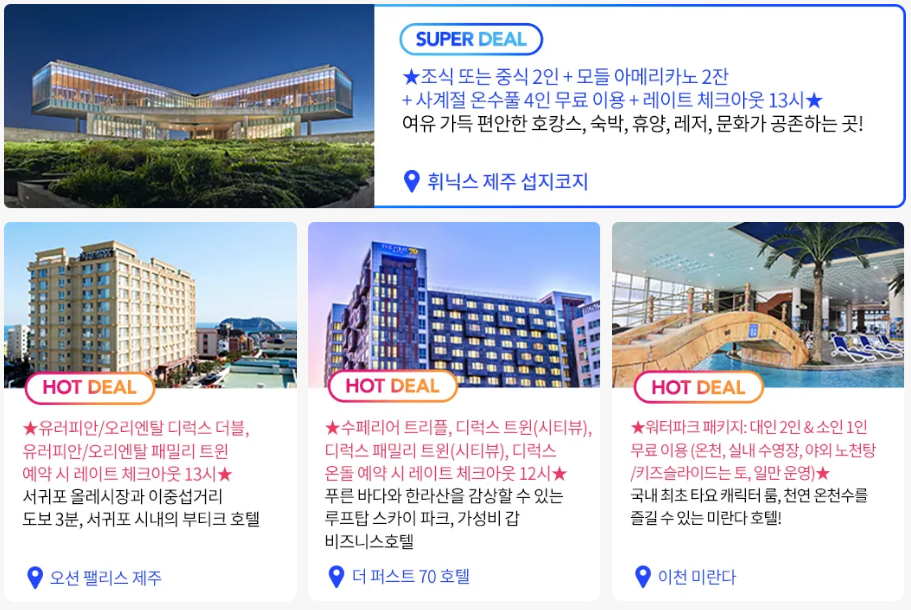 그중 대표 상품으로 제주 휘닉스 섭지코지가 포함되었다. 조식 또는 중식, 아메리카노 2인씩 포함되며 레이트 체크아웃에 온수풀 4인 무료 이용까지 가능한 휘닉스 제주 섭지코지 상품이 궁금하다면, 다른 호텔들의 혜택도 궁금하다면 이벤트 페이지를 확인하자.