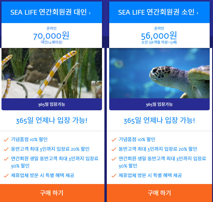 연간회원권은 1년간 무제한으로 입장 가능한 회원권이다. 부산 SEALIFE 아쿠아리움에 연간 4회 이상 방문할 계획이 있다면 연간회원군을 구매하는 것이 훨씬 유리하다.