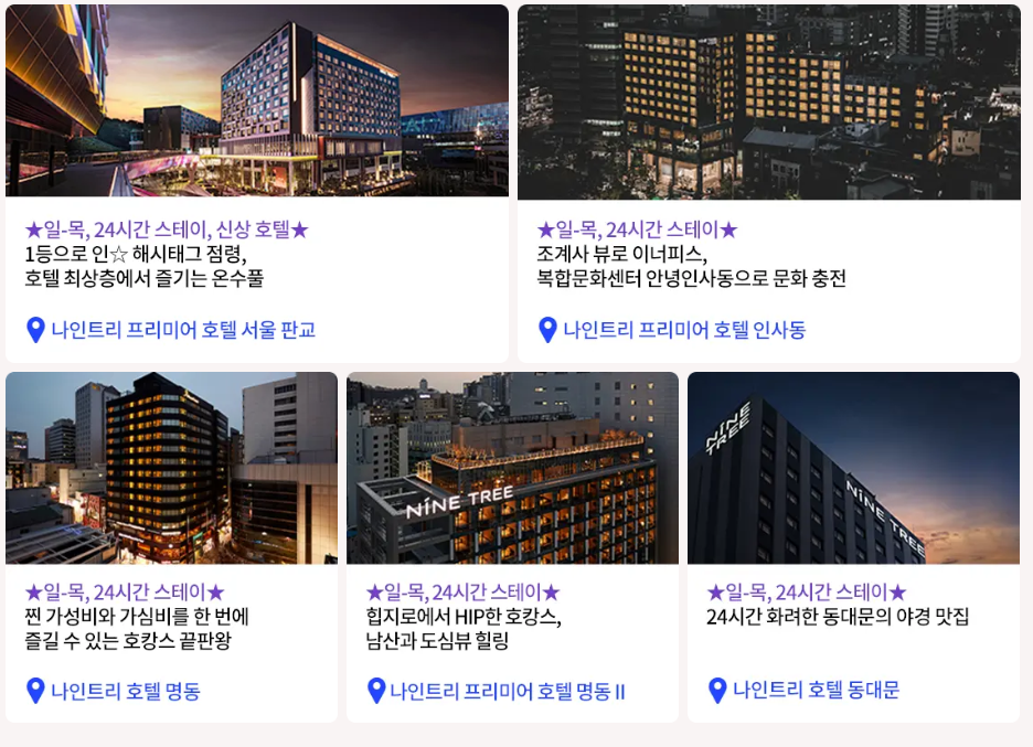 참여하는 호텔은 나인트리 프리미어 호텔 서울 판교, 인사동, 명동, 명동II, 동대문이다. 모두 주중 기준 24시간 스테이가 가능하며 각 날짜별로 24시간 스테이 요금이 다르니 자세한 요금은 아래에서 확인하자.