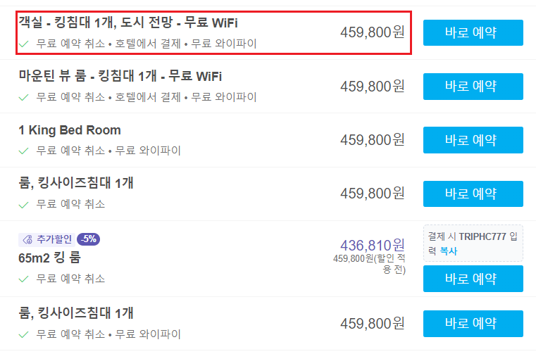 자, 어떤가. kkday 호텔 세일과 비교해봐도 크레딧 혜택도 없고 조식 혜택도 없는데 오히려 가격이 더 비싸다는 것을 확인할 수 있다. kkday 호텔 세일은 호텔 할인 코드까지 사용해서 조식 2인+5만 원 크레딧 받고도 414,000원에 예약 가능하다. 실제 조식이 1인당 6만 원인점을 고려하면 압도적을 kkday 호텔 세일이 훨씬 유리하다는 것을 알 수 있다.